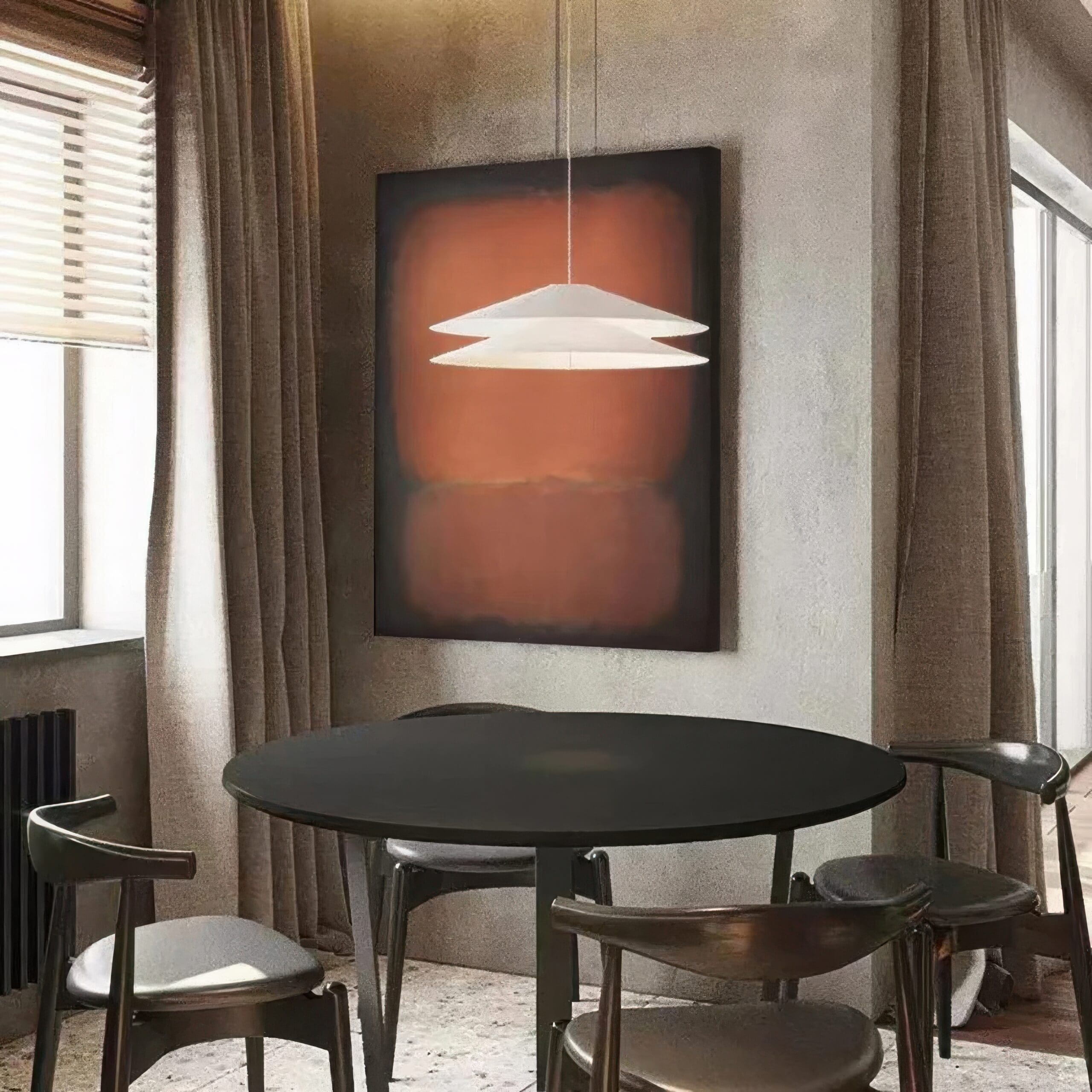 Contrastul dintre tonurile întunecate și accentele de culoare caldă evocă o lumină care se stinge, sugerând un moment de liniște absolută. Această piesă poate fi încadrată modern pentru a sublinia aspectul său contemporan și se potrivește perfect în livinguri elegante sau spații de lucru care caută o notă distinctă.
