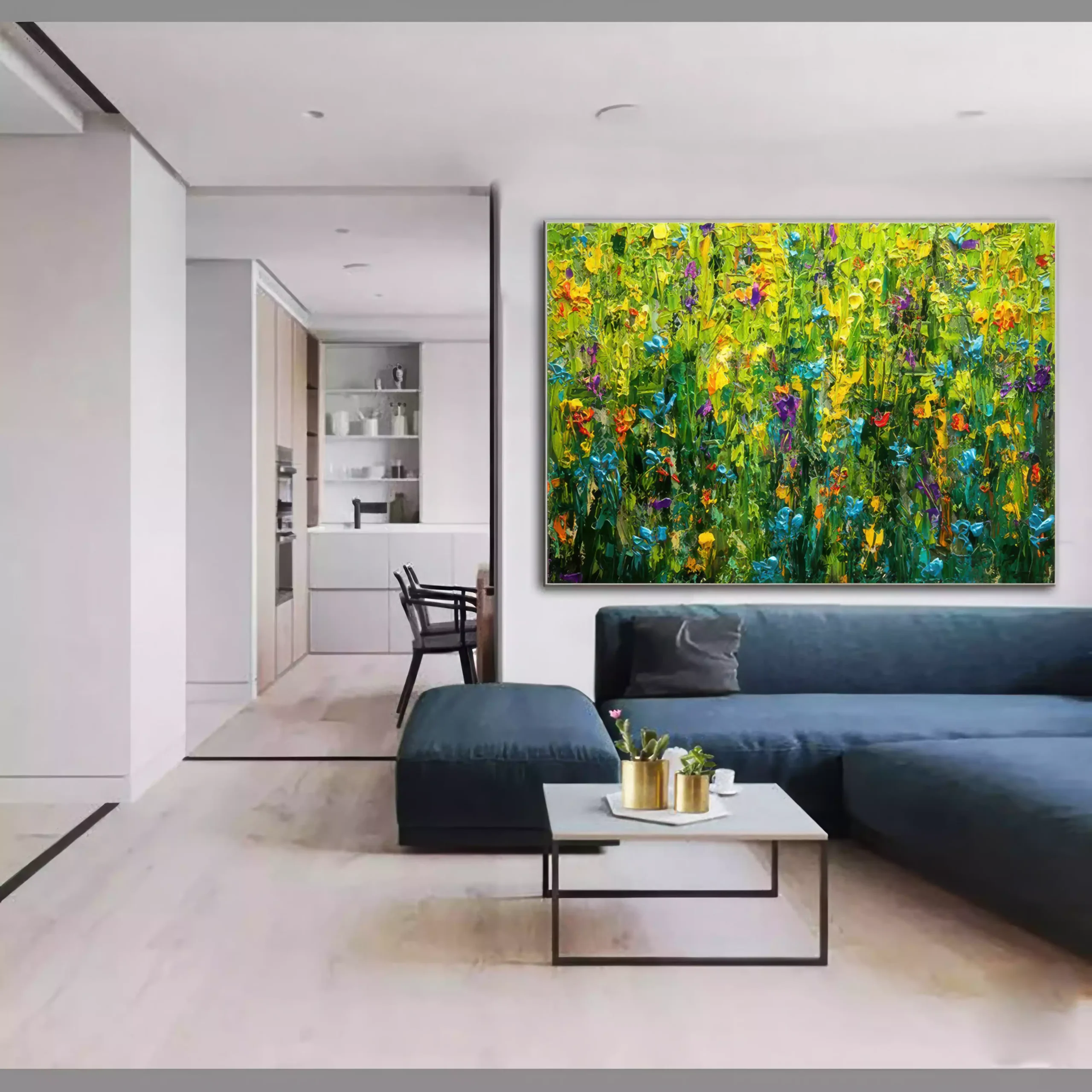 „Campul Viu al Primaverii” surprinde esenta anotimpului renasterii, plin de flori in culori vibrante ce danseaza in bataia vantului. Tehnica impasto, aplicata cu cutitul de paleta si pasta de relief, confera tabloului o textura bogata si o profunzime impresionanta. Straturile groase de acril creeaza un efect tridimensional, iar gama de culori – de la verde proaspat la albastru intens si galben stralucitor – transforma pictura intr-un spectacol vizual. Piesa poate fi inramata modern, aducand un strop de primavara vesnica in casa ta.