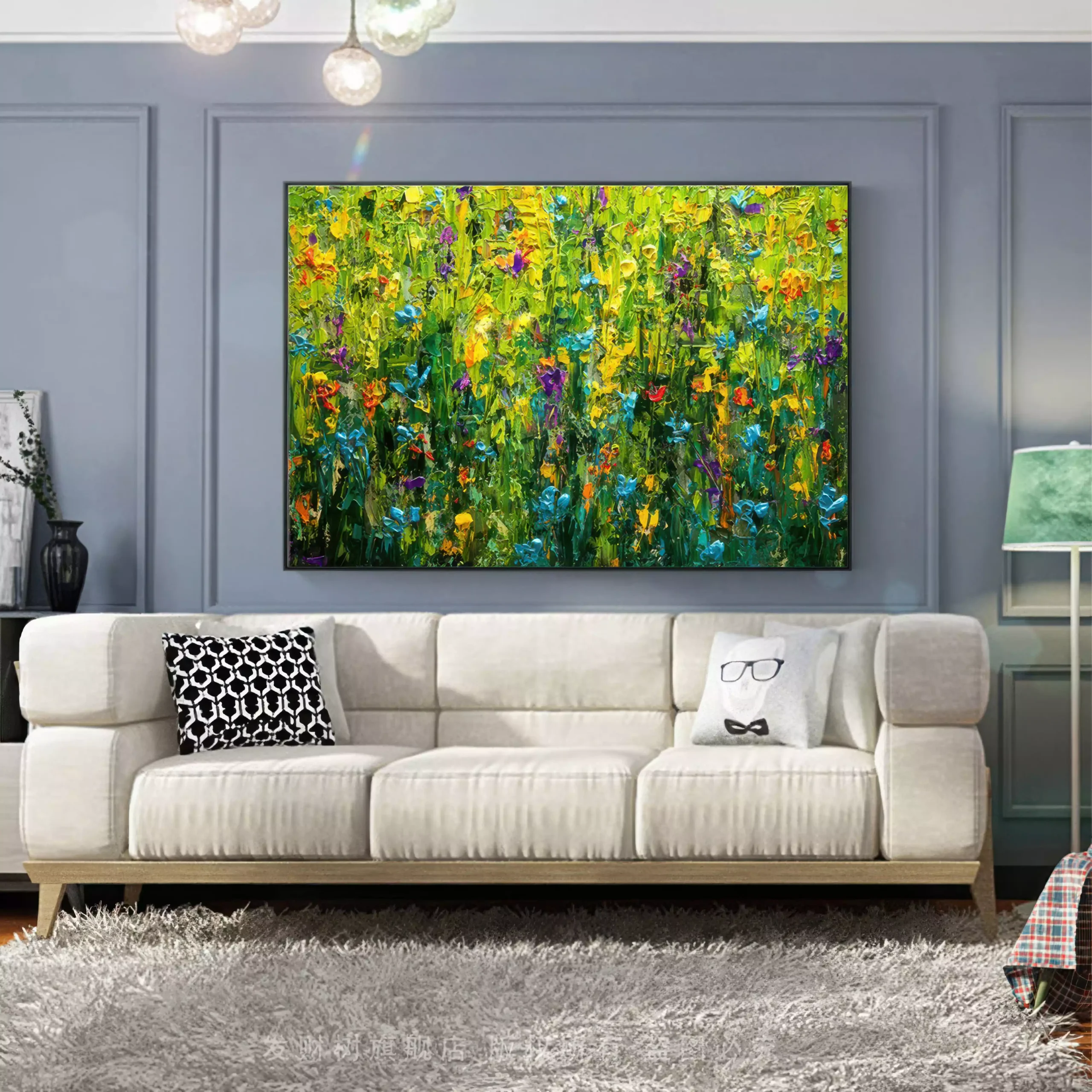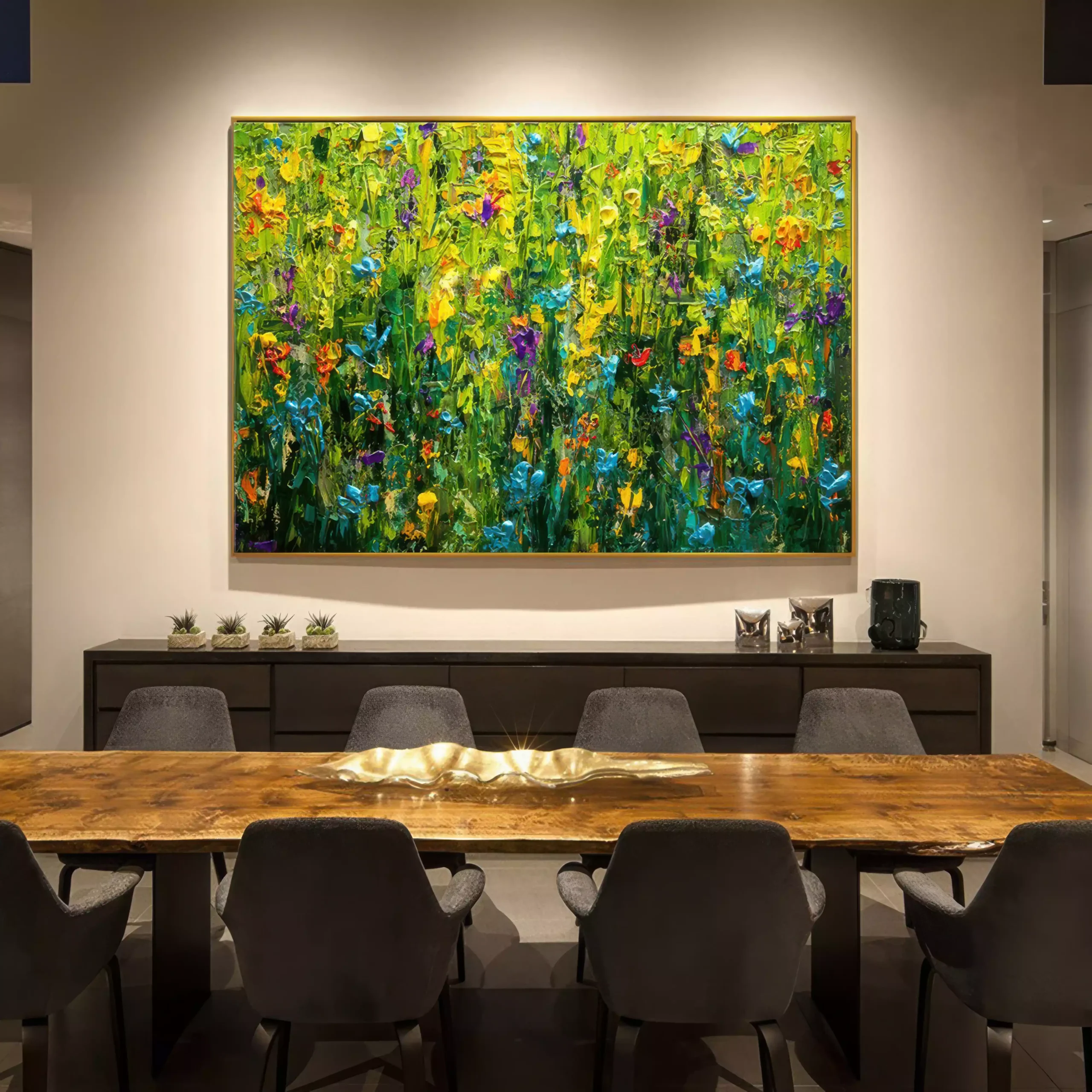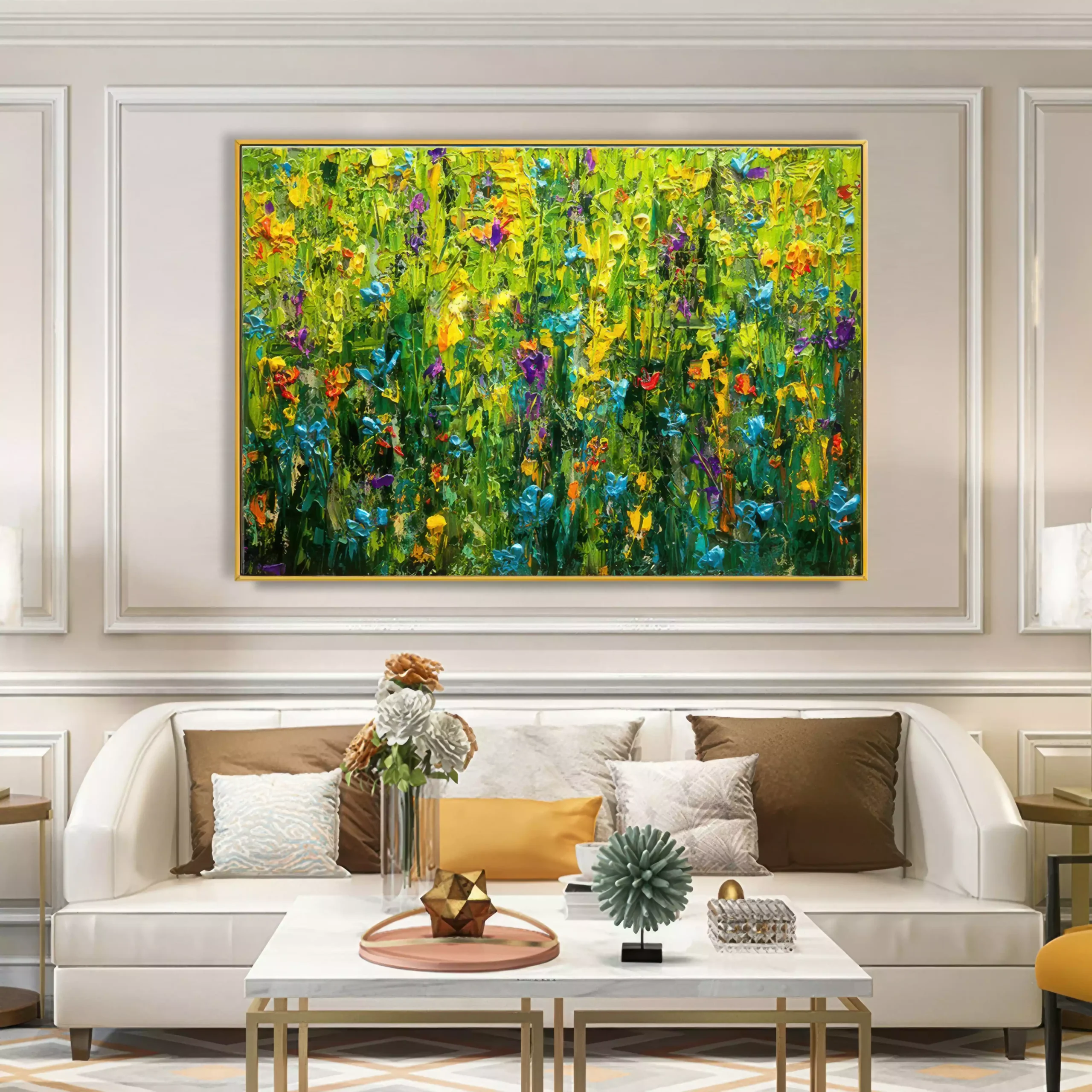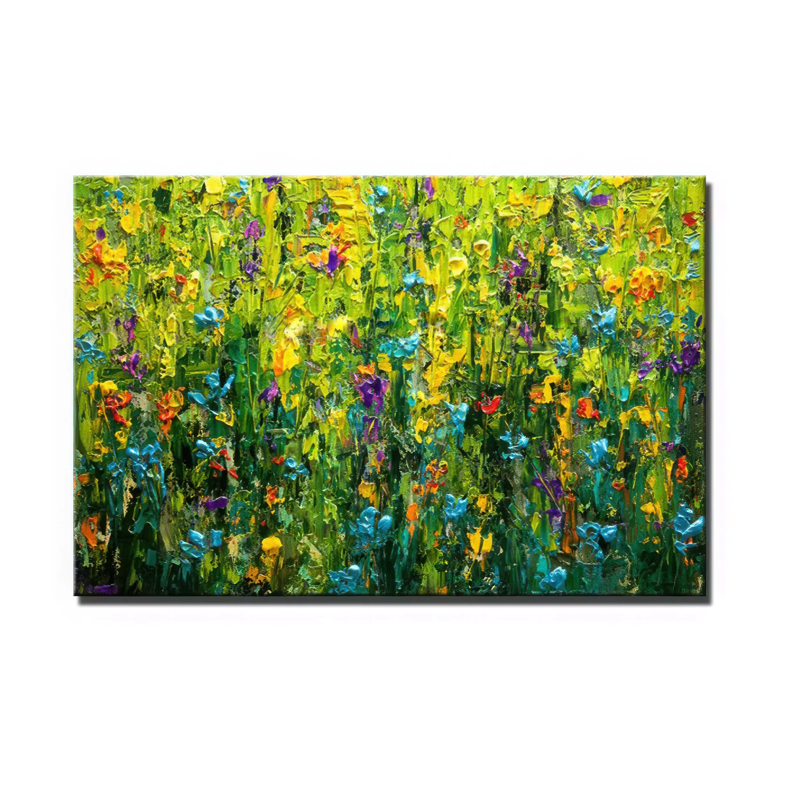 Un tablou impasto bas-relief pictat in culori acrilice, ce surprinde un peisaj floral plin de dinamism si prospetime.