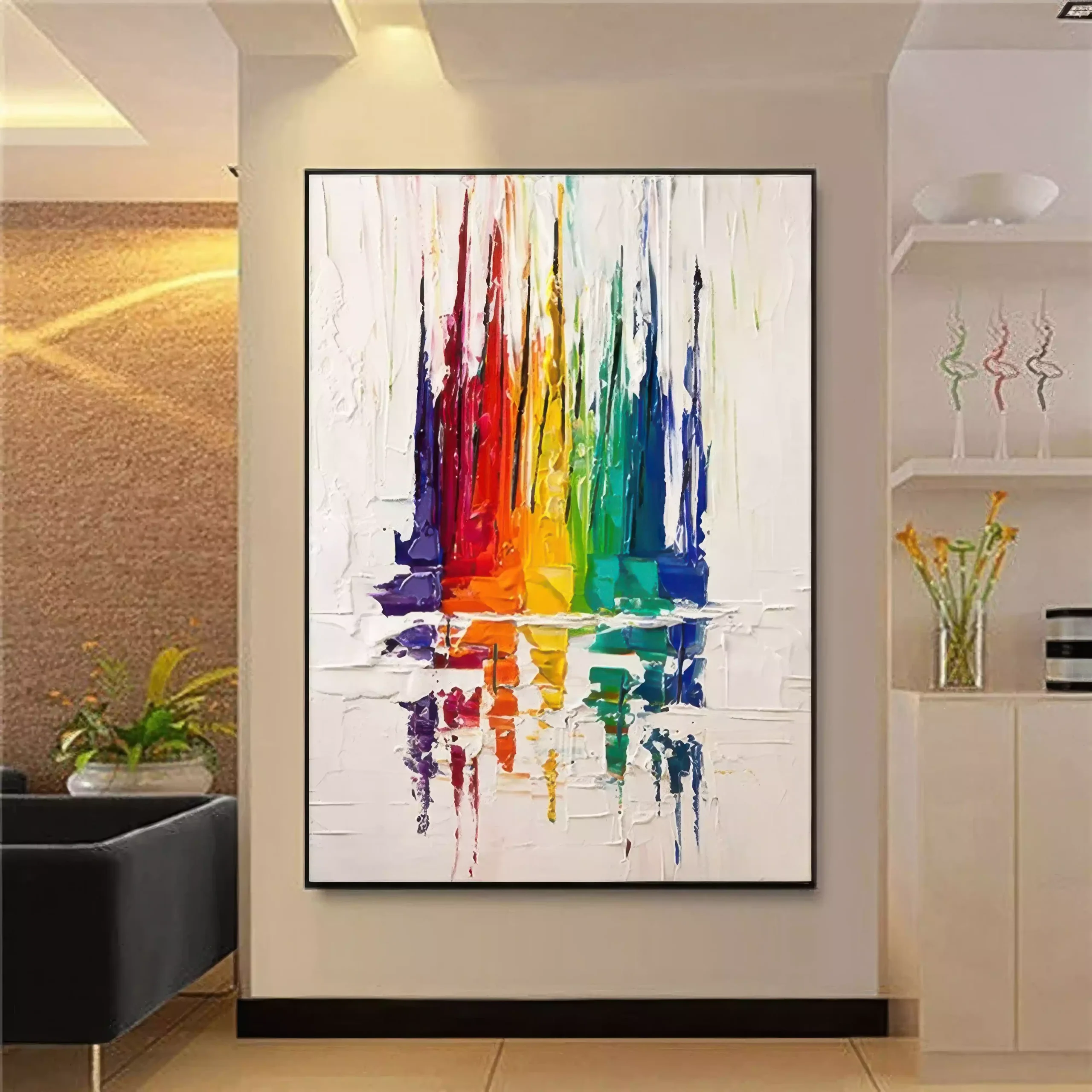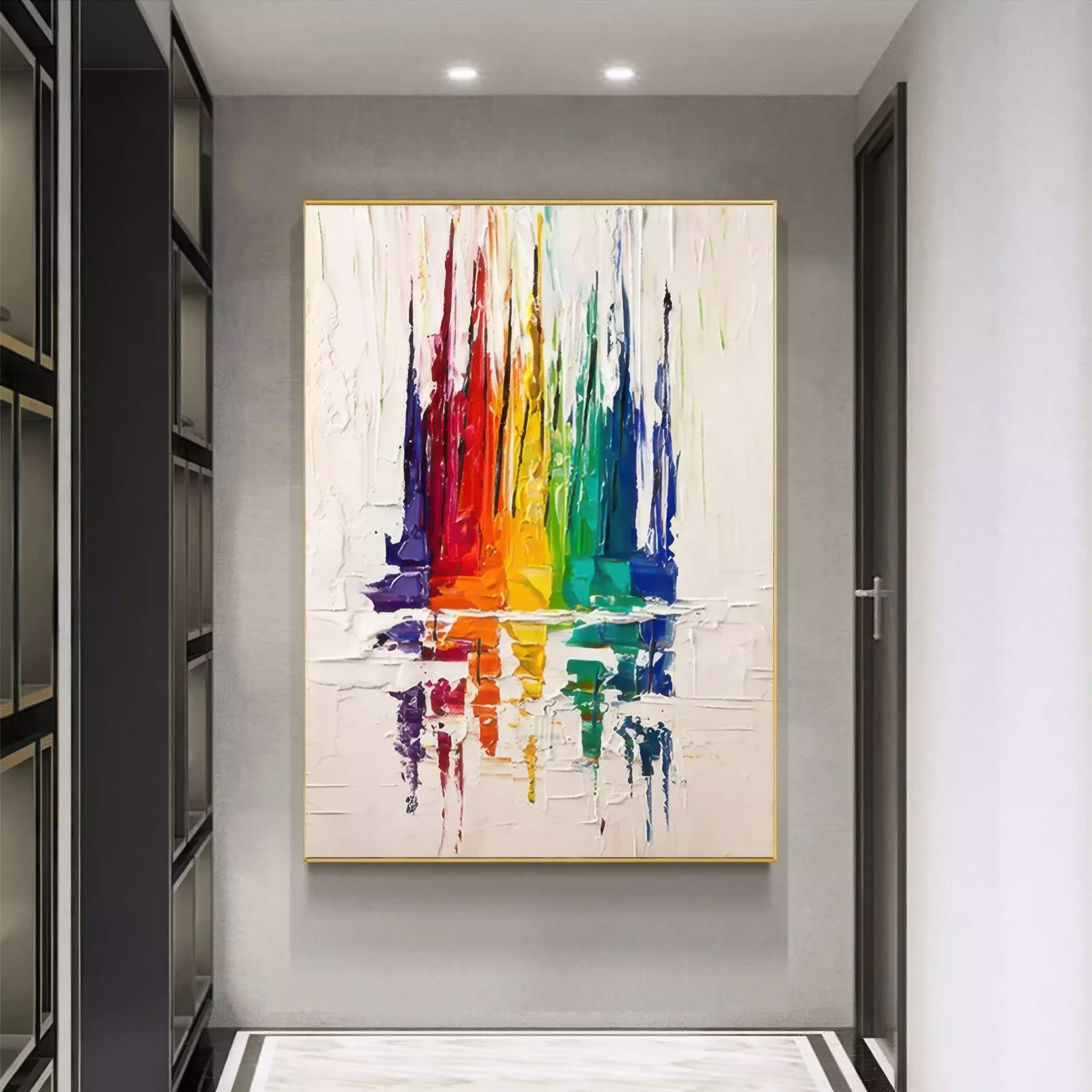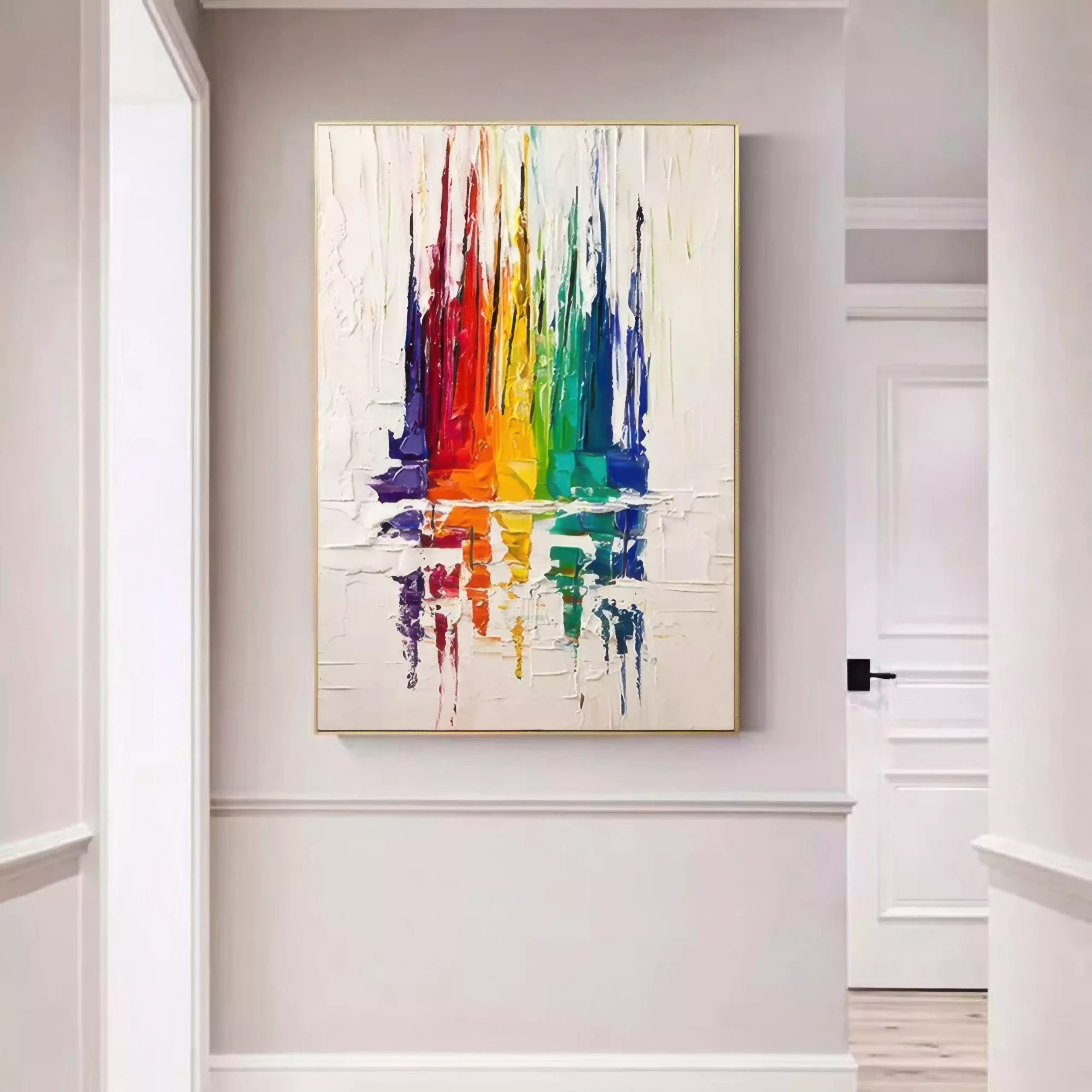„Cascadele Curcubeului” reda emotia si spontaneitatea momentului, fiind o expresie artistica a miscarii. Culorile acrilice sunt aplicate intr-un mod ce permite contrastul si armonia dintre nuantele intense, accentuate prin tehnica impasto. Utilizarea cutitului de paleta si a pastei de relief confera suprafetei o textura captivanta si un efect vizual tridimensional. Tabloul se poate inrama intr-un stil modern, adaugand o nota contemporana spatiilor de locuit si birourilor elegante.