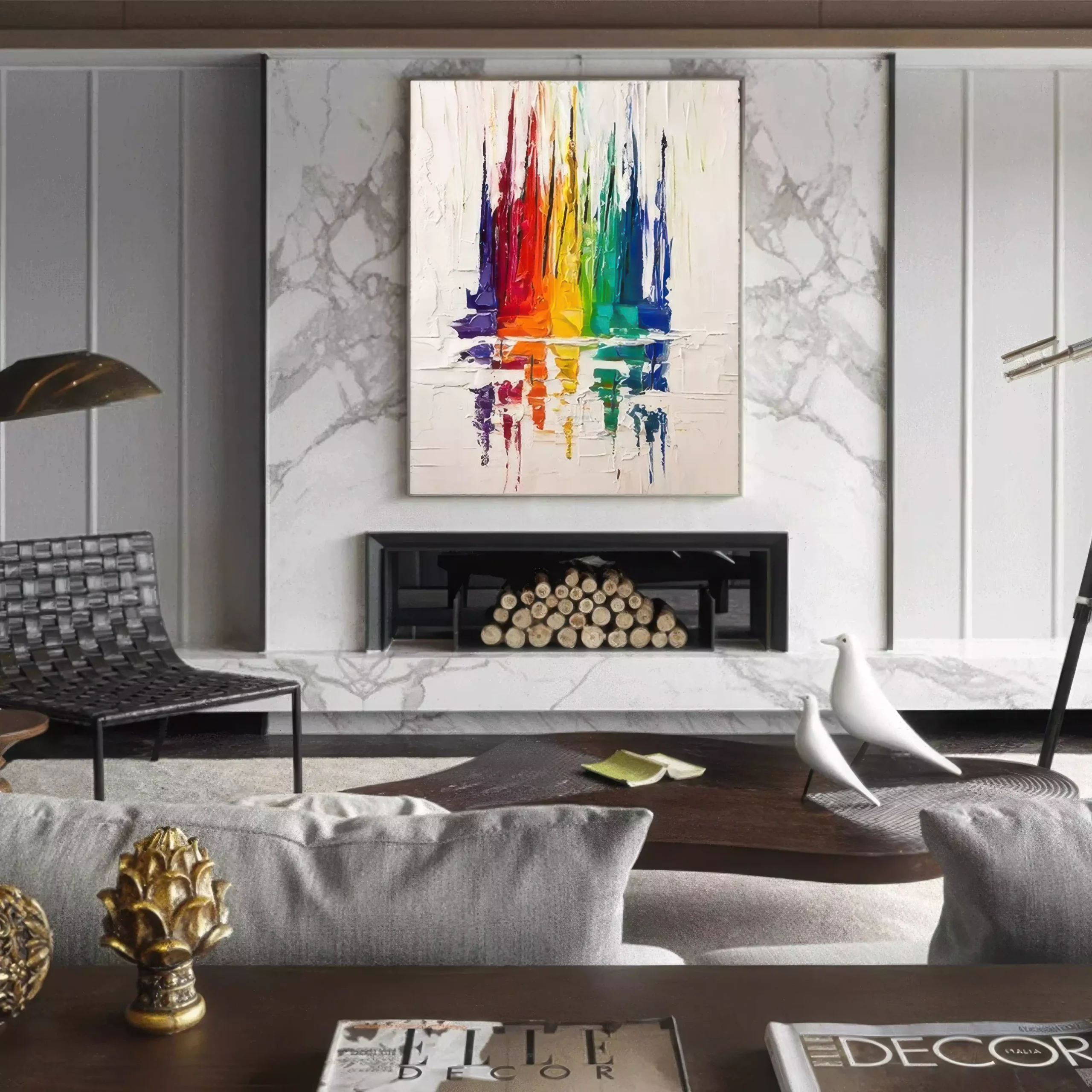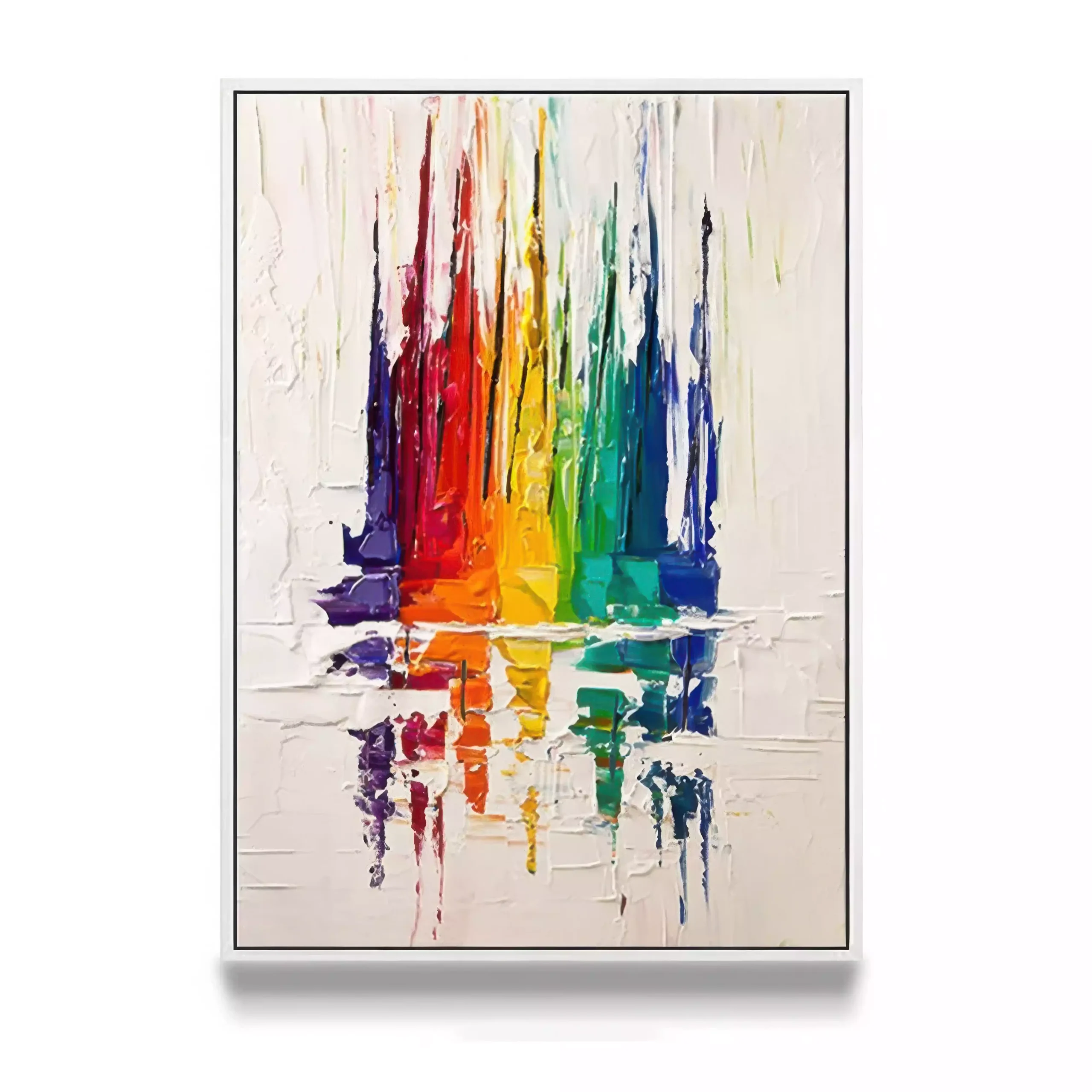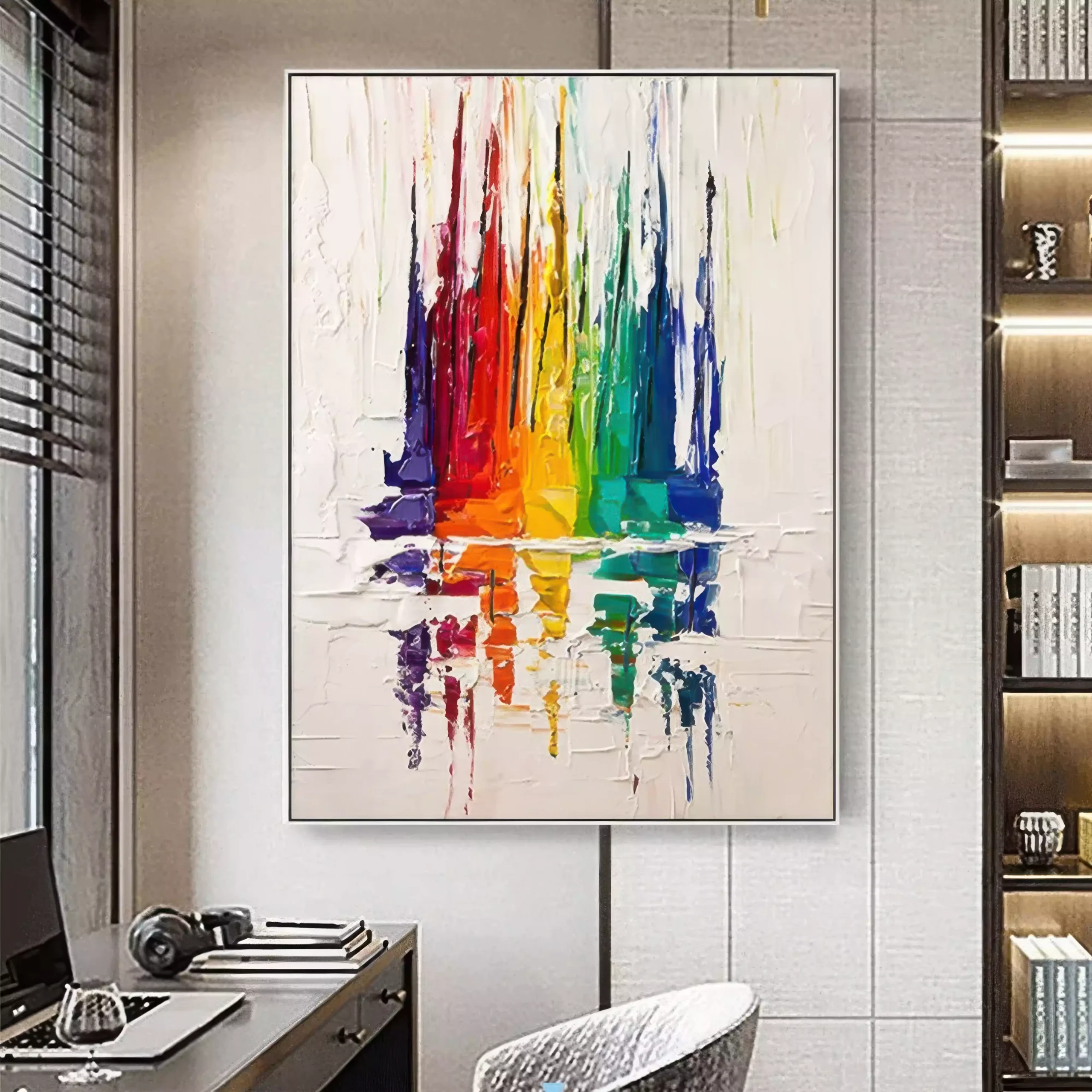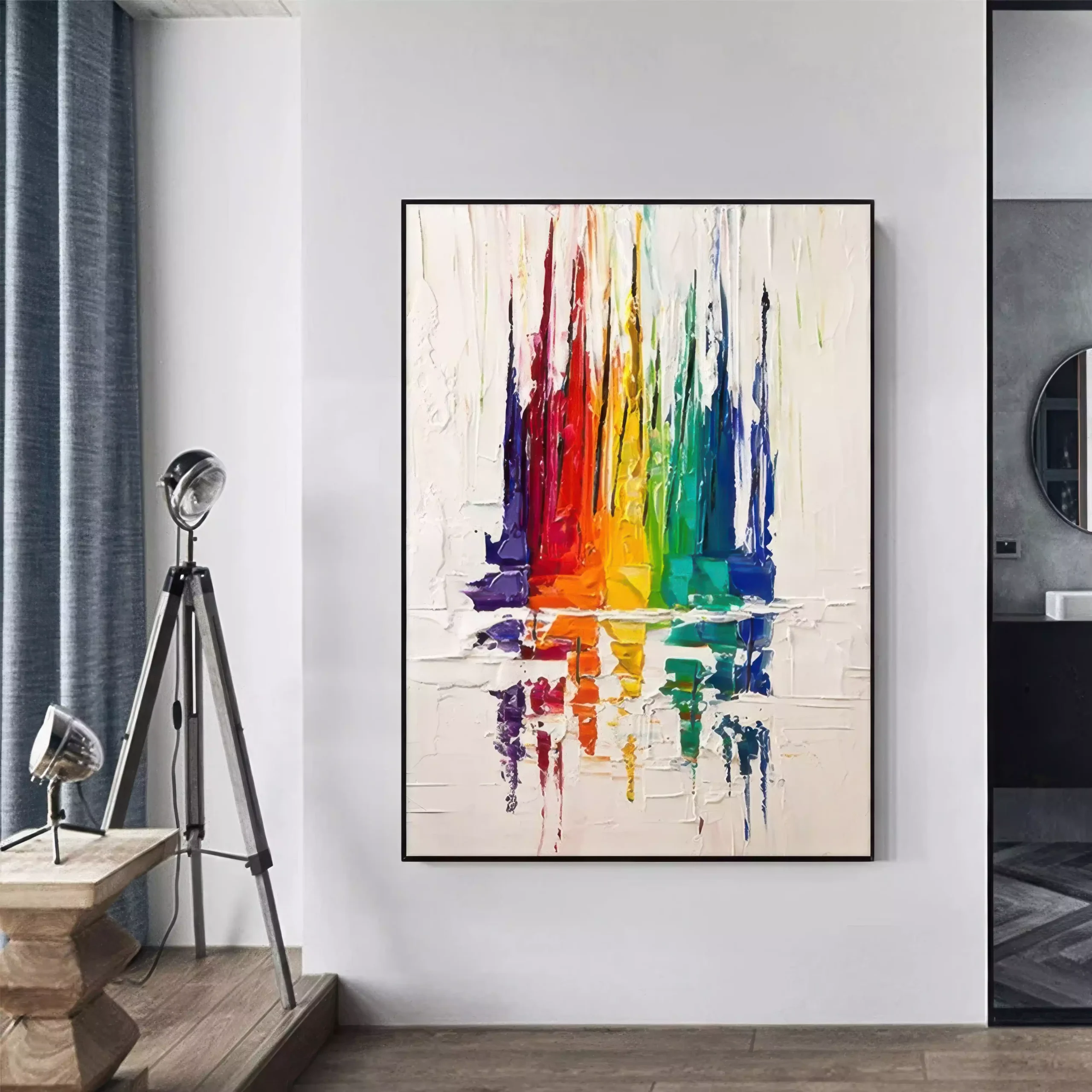 „Cascadele Curcubeului” reda emotia si spontaneitatea momentului, fiind o expresie artistica a miscarii. Culorile acrilice sunt aplicate intr-un mod ce permite contrastul si armonia dintre nuantele intense, accentuate prin tehnica impasto. Utilizarea cutitului de paleta si a pastei de relief confera suprafetei o textura captivanta si un efect vizual tridimensional. Tabloul se poate inrama intr-un stil modern, adaugand o nota contemporana spatiilor de locuit si birourilor elegante.