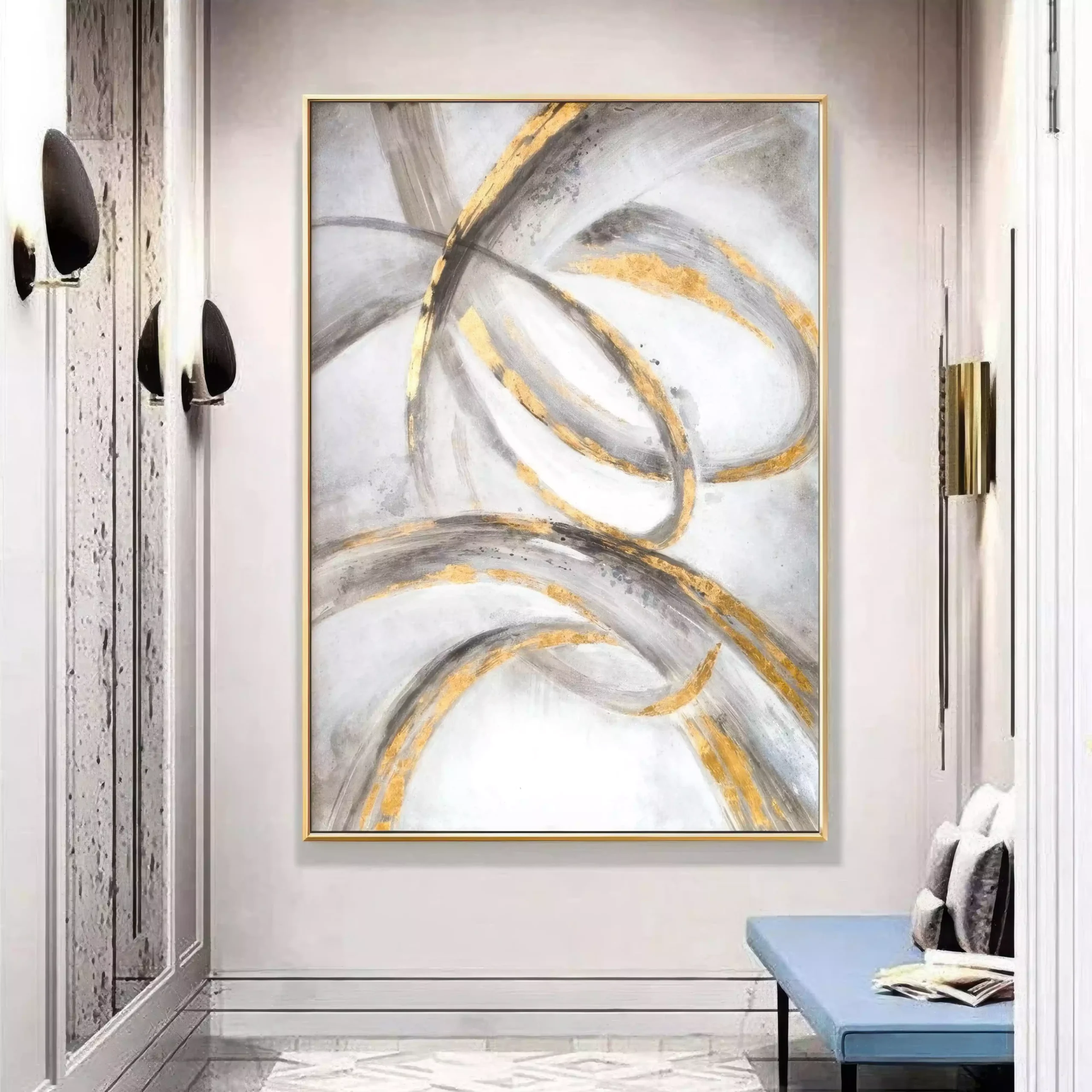 O piesa de arta abstracta care capteaza esenta miscarii prin linii sinuoase si accente aurii.