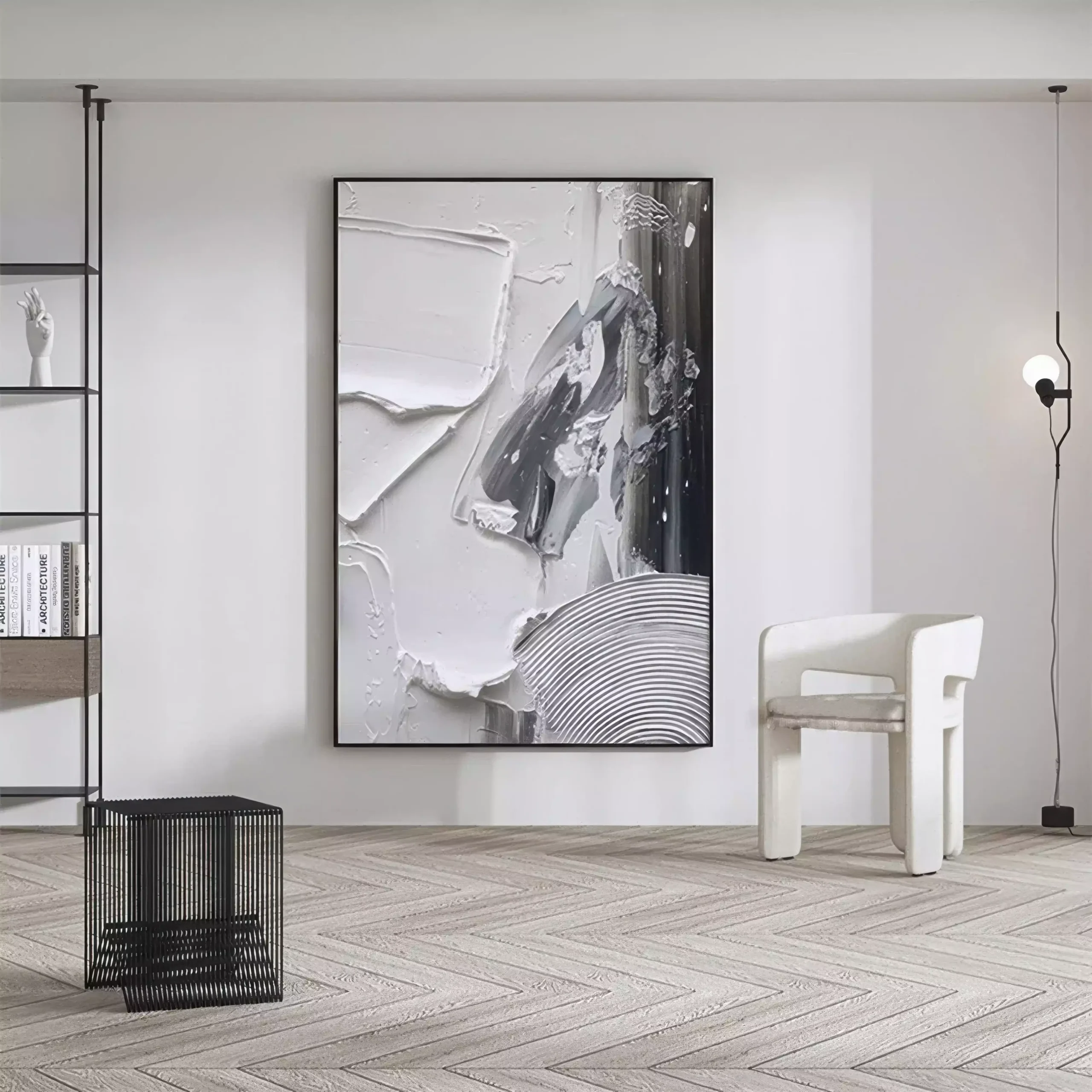 Tehnica impasto, utilizând cuțitul de paletă și pasta de relief, oferă tabloului o adâncime remarcabilă și o senzație tridimensională. Tonurile albe pure și nuanțele de gri se îmbină într-un dans armonios, creând un sentiment de pace și introspecție. Această piesă se potrivește perfect într-un spațiu modern, aducând o notă de eleganță și sofisticare. Într-o ramă modernă, tabloul devine un punct focal remarcabil al oricărei încăperi.