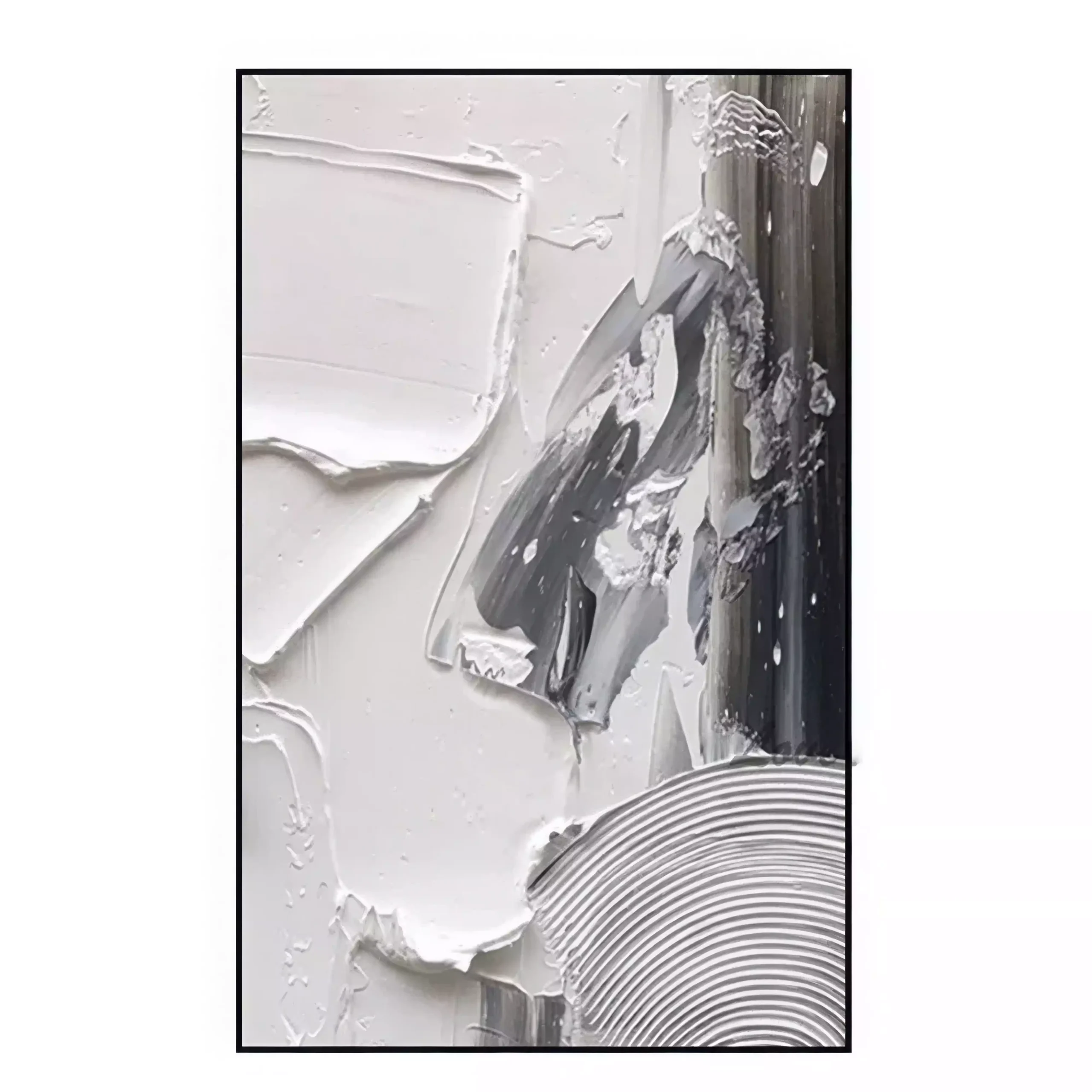 O piesă abstractă în culori acrilice, ce juxtapune tonuri albe și gri pentru un efect vizual impunător.