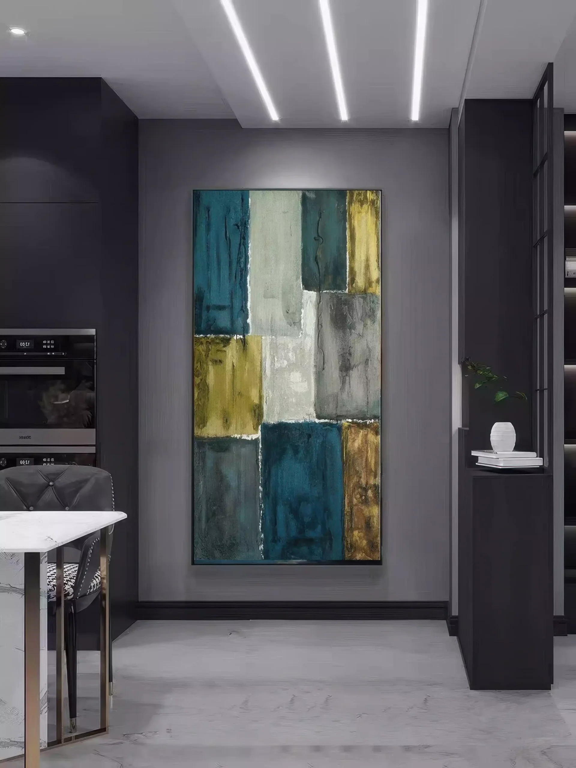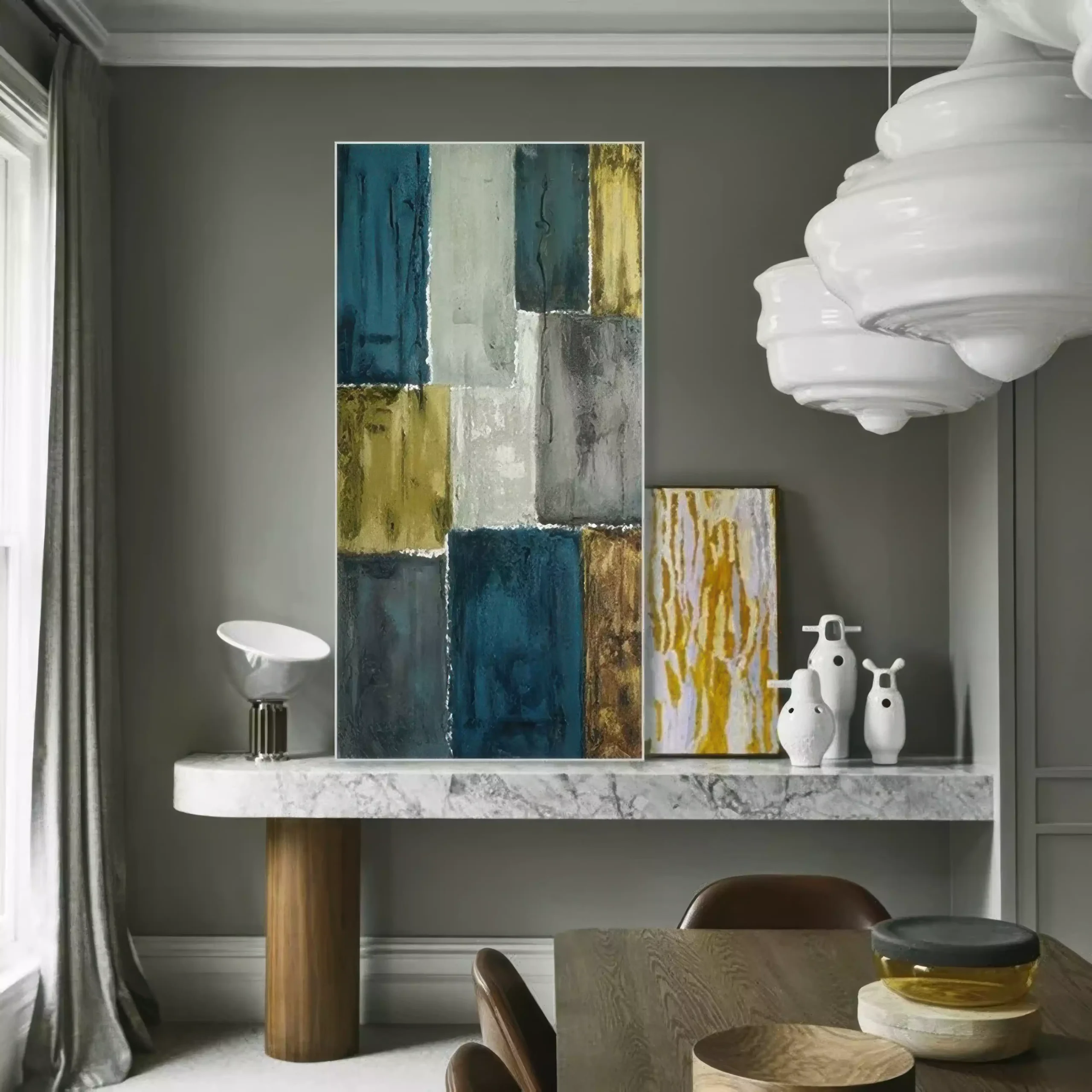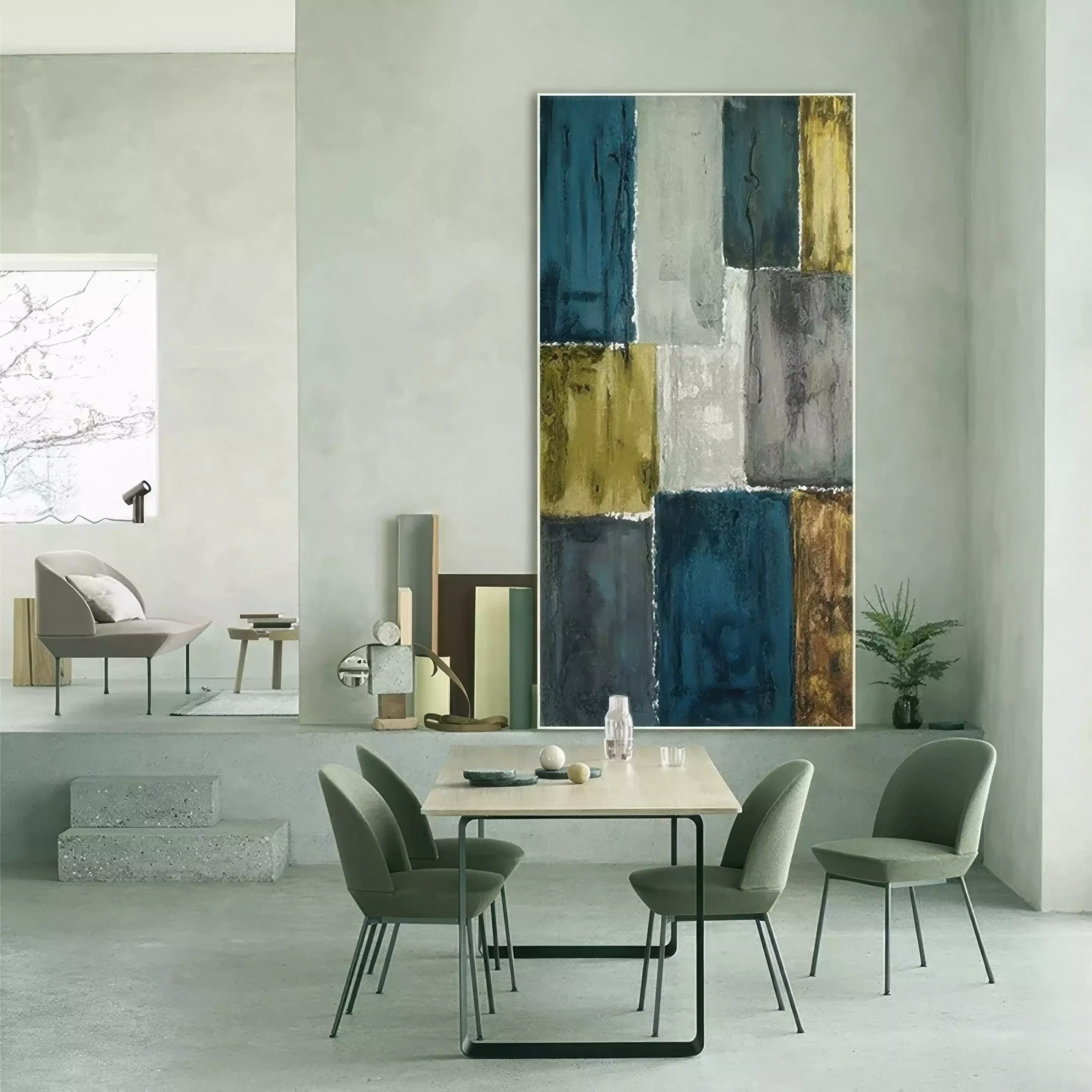 Un tablou abstract cu texturi bogate si culori acrilice subtile, creand o compozitie eleganta ce evoca introspectie si profunzime.