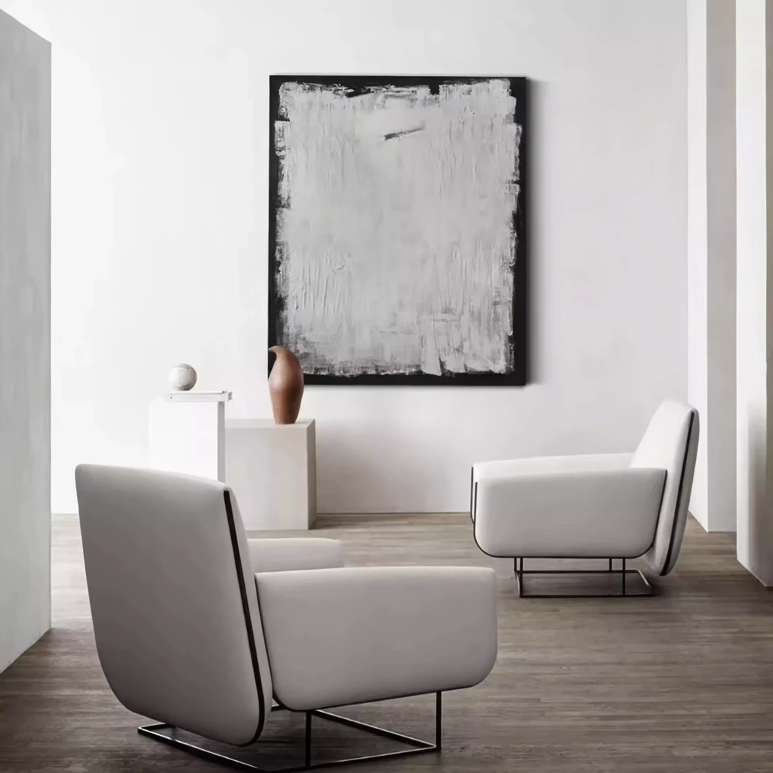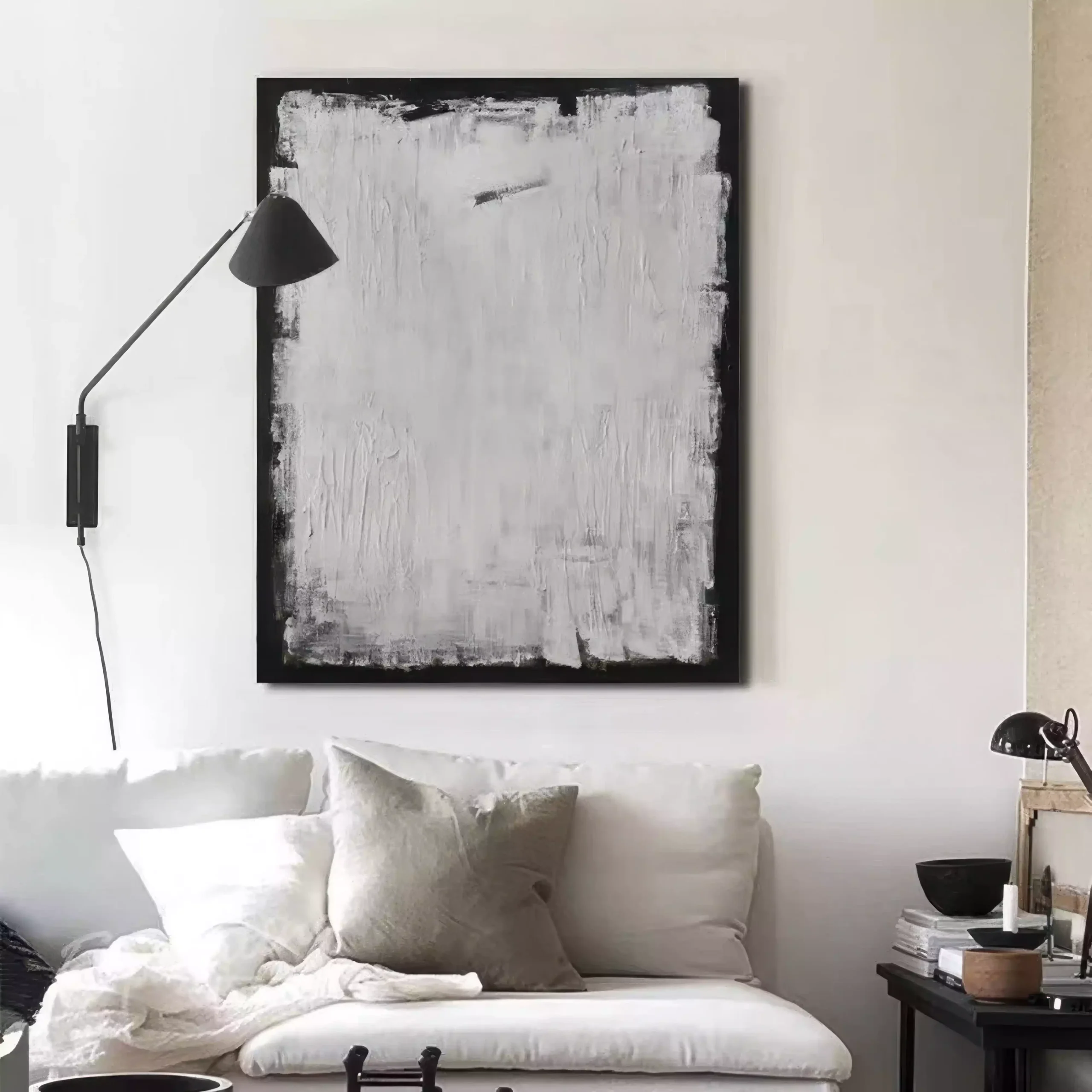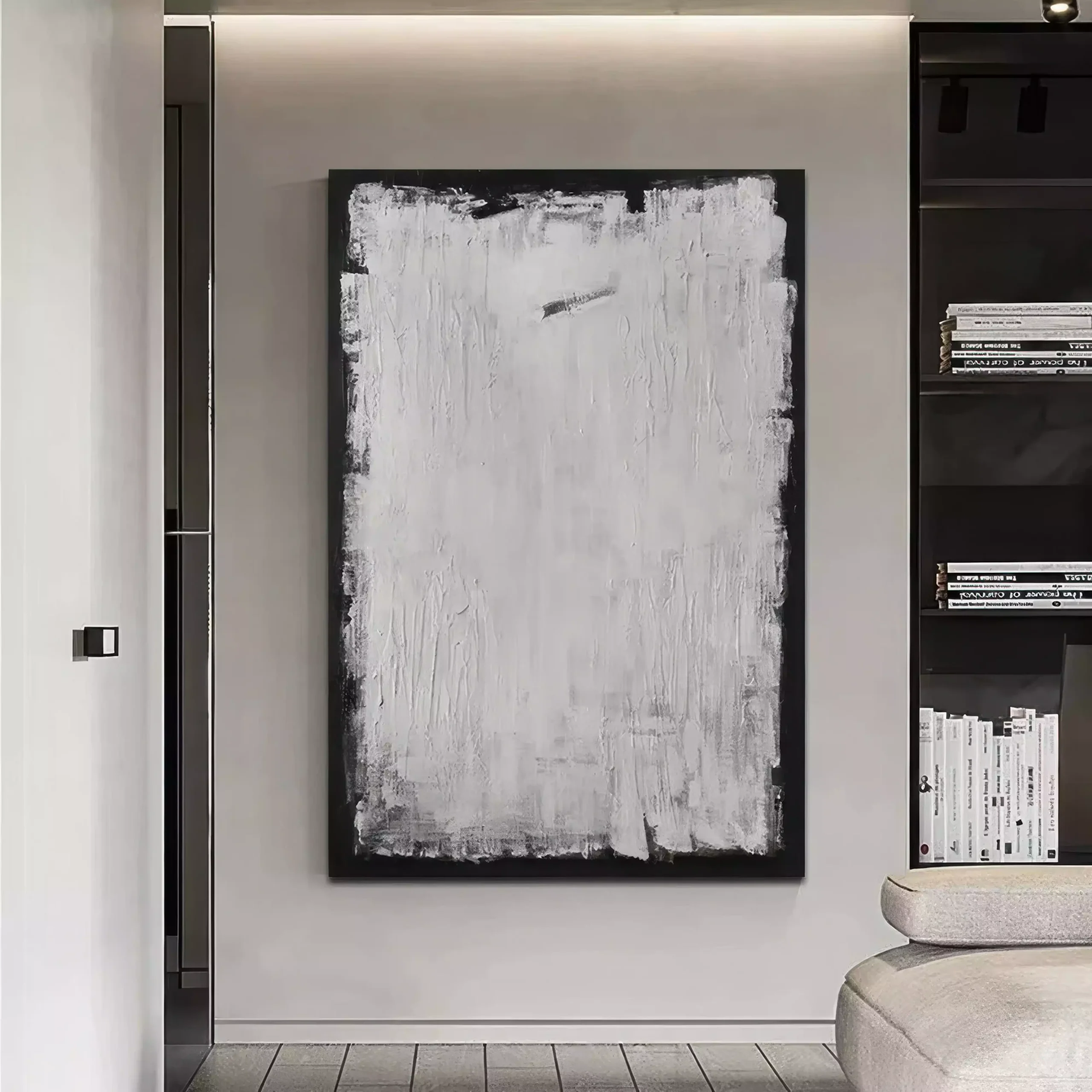 Un tablou abstract ce îmbină armonios albul textural cu o ramă întunecată, creând un efect de adâncime și simplitate.