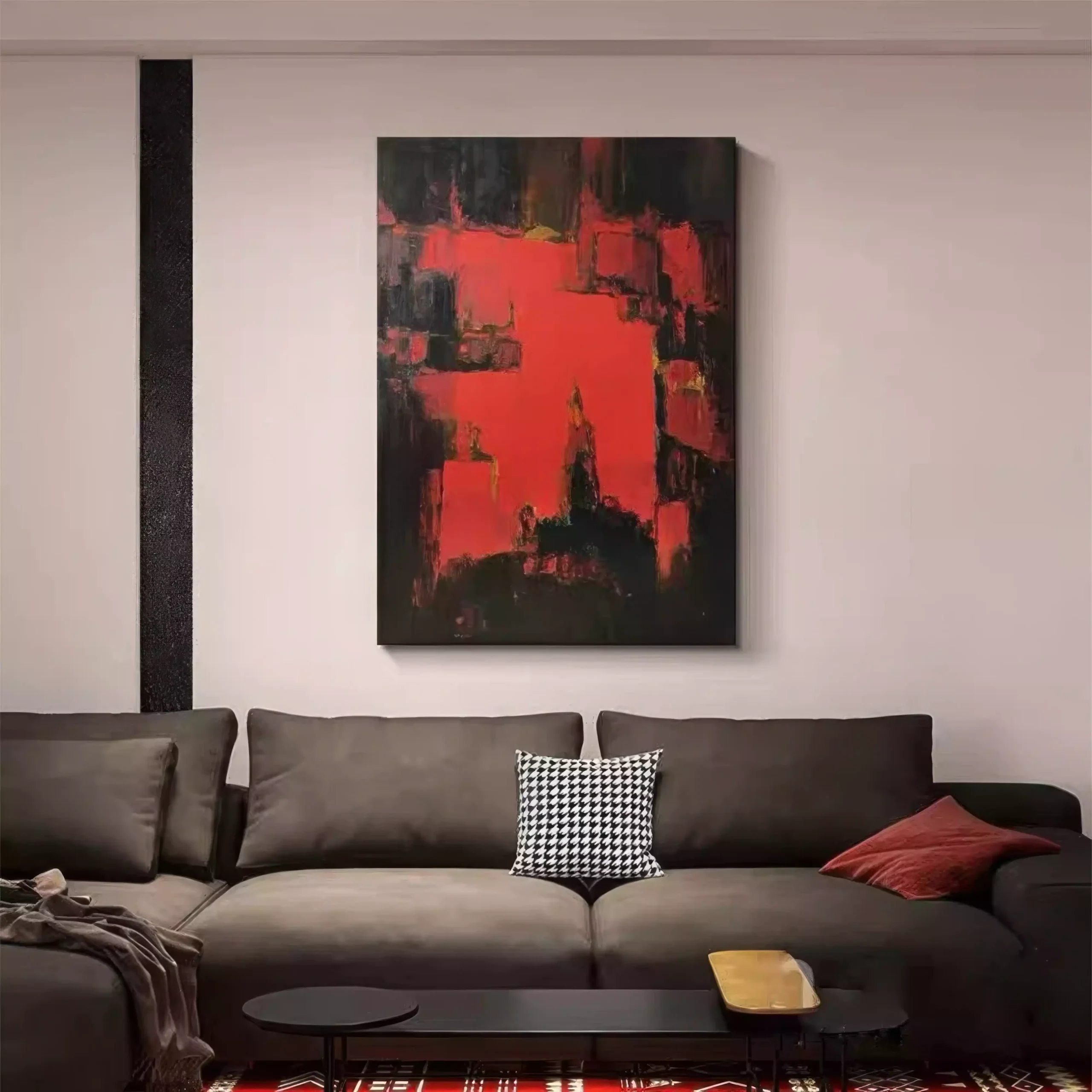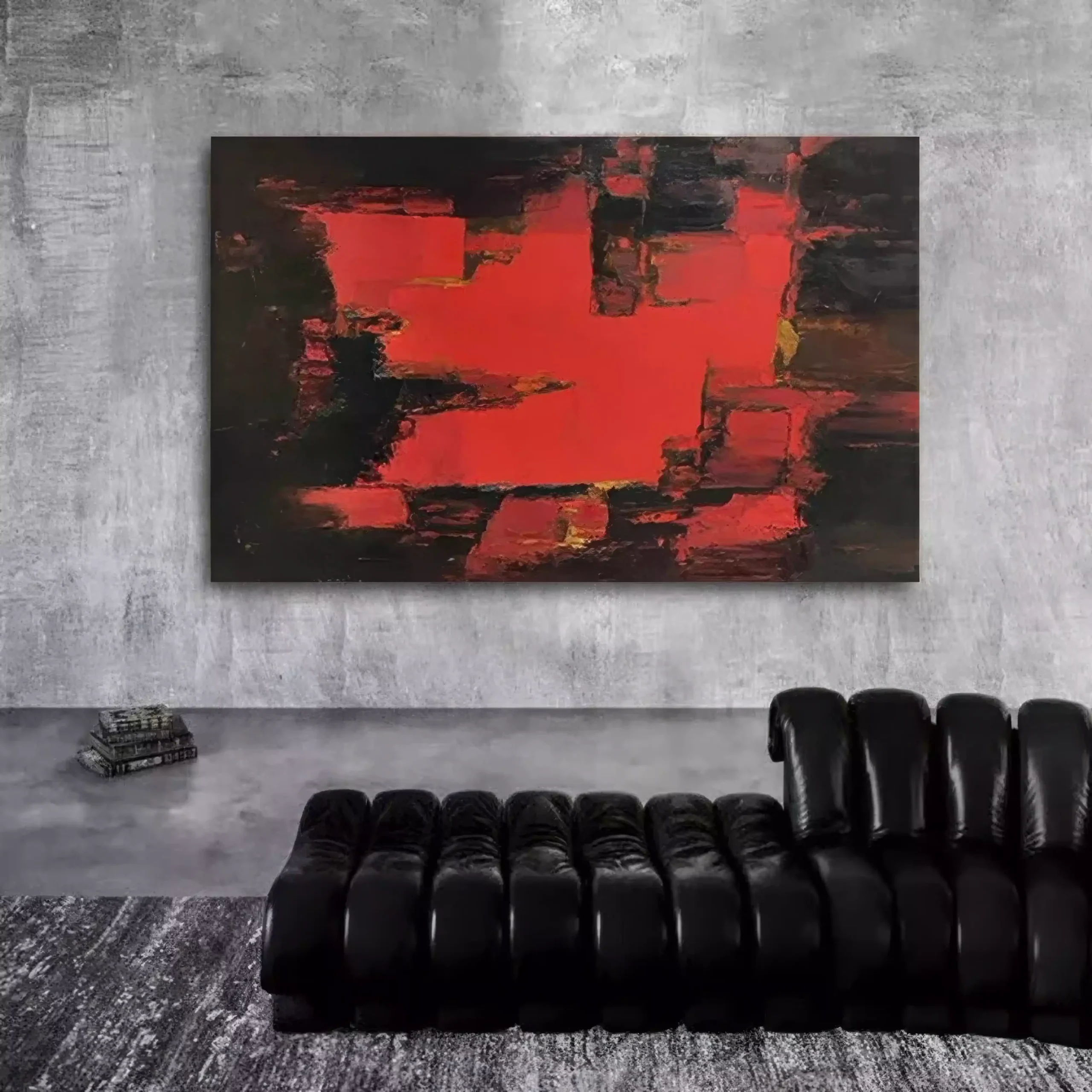 Pictura abstracta cu accente dramatice, in nuante de rosu intens si negru, realizata in tehnica impasto.