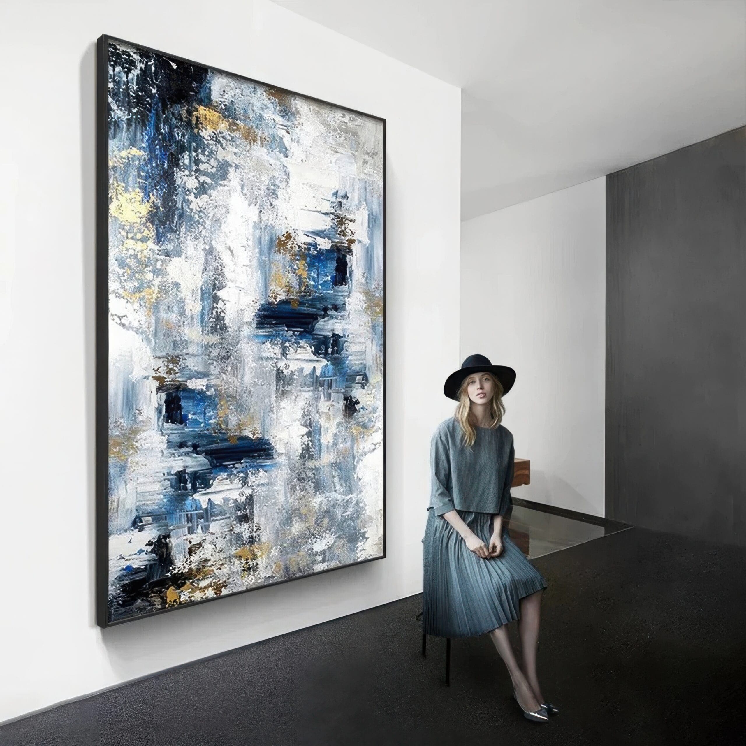 „Reflexii de Albastru și Aur” este o operă de artă ce captează atenția prin echilibrul perfect dintre profunzime și eleganță. Tehnica impasto, aplicată cu cuțitul de paletă și straturi de pastă de relief, creează o textură captivantă, ce aduce o notă de tridimensionalitate fiecărui detaliu. Nuantele de albastru și accentele aurii sunt perfect îmbinate, sugerând un peisaj urban sau reflexia apelor sub cerul luminat. Aceasta piesă poate fi încadrată modern, aducând un plus de rafinament în livinguri, holuri elegante sau birouri cu un design contemporan.