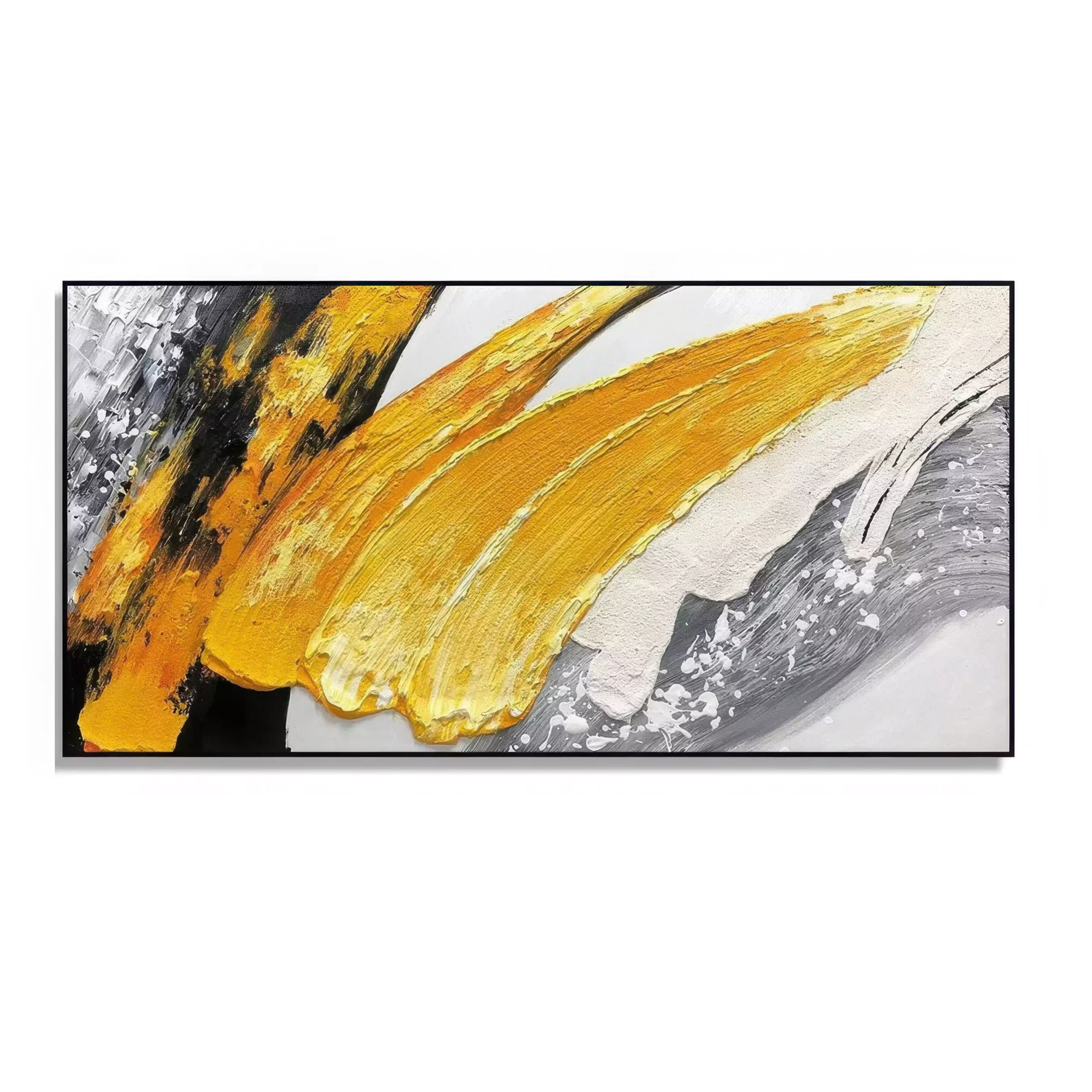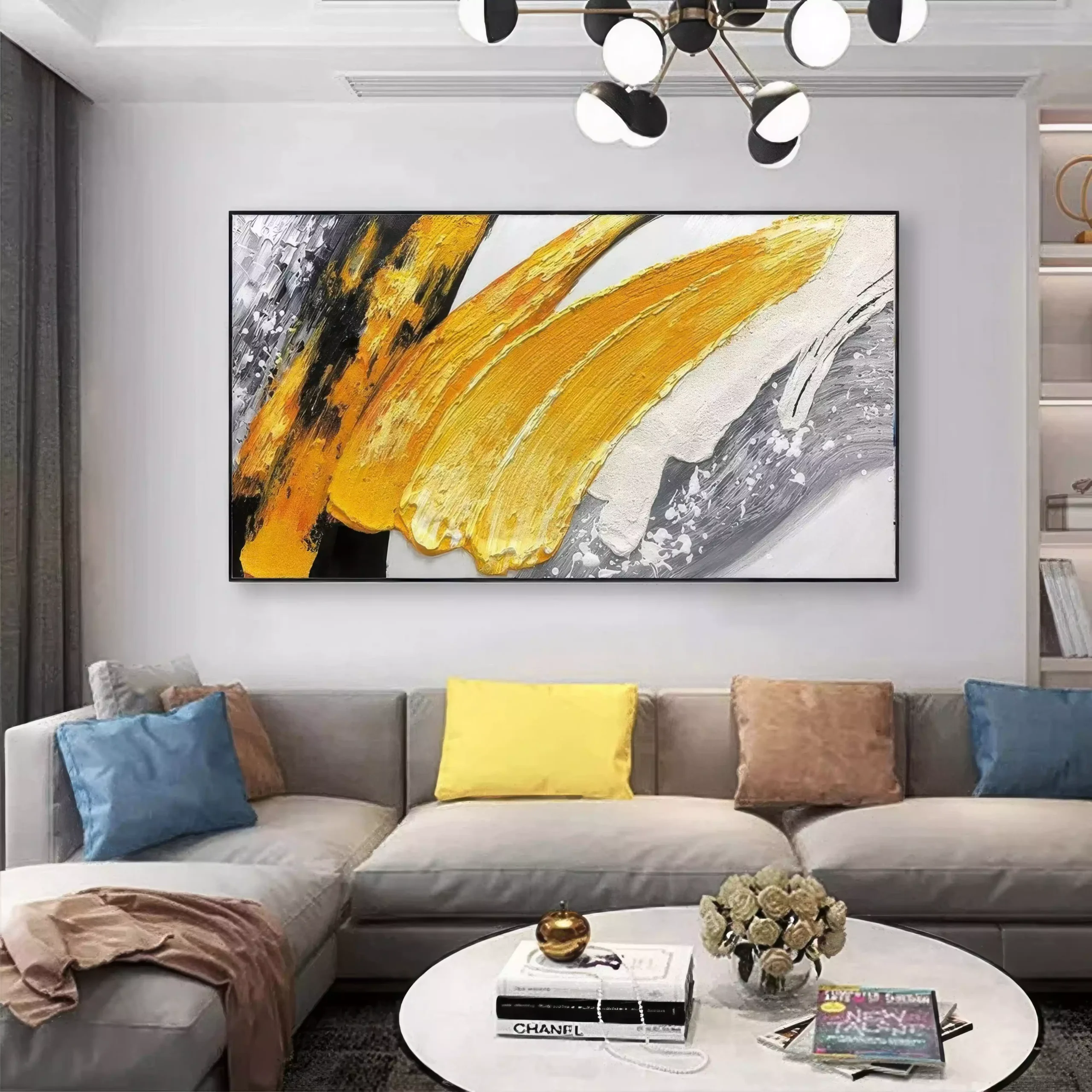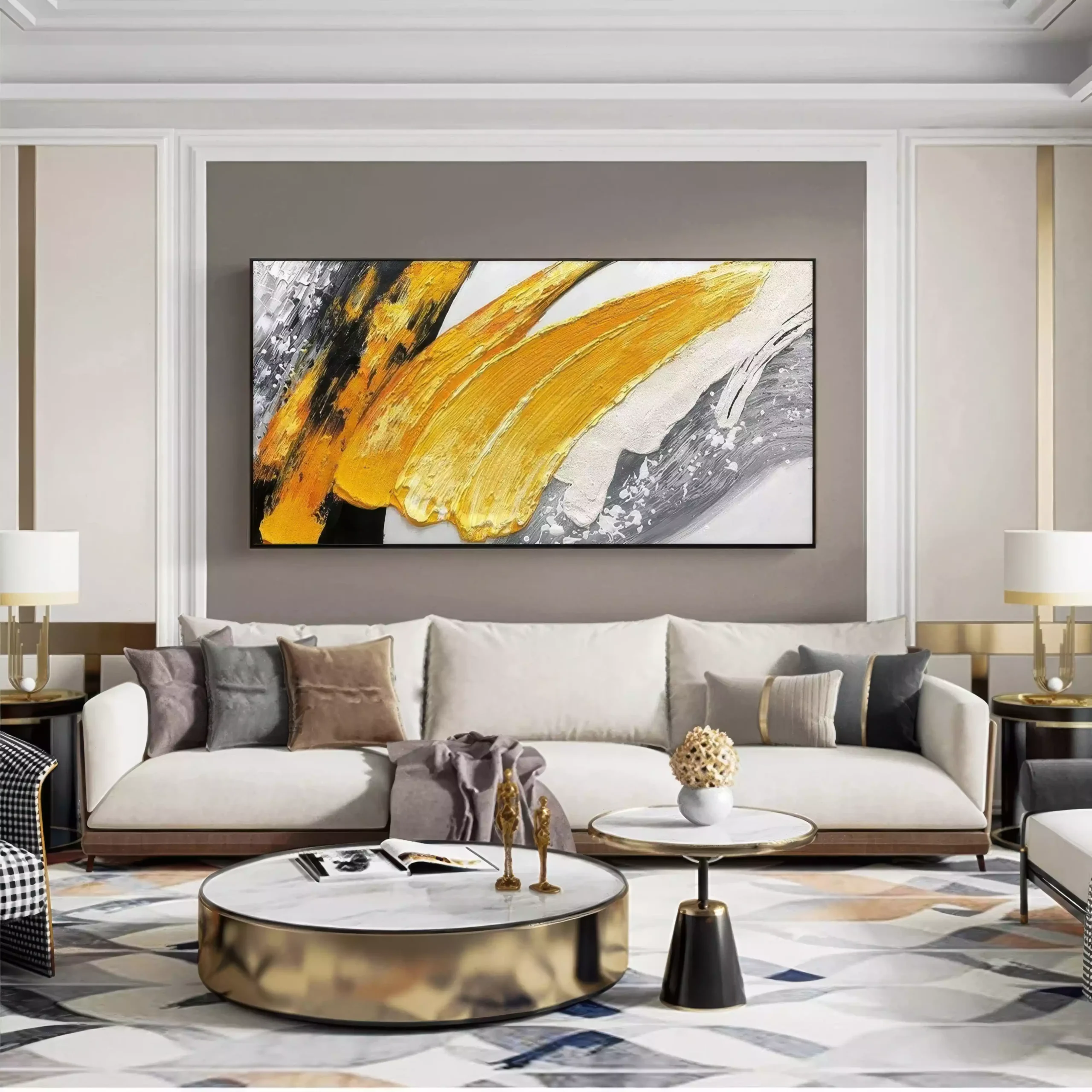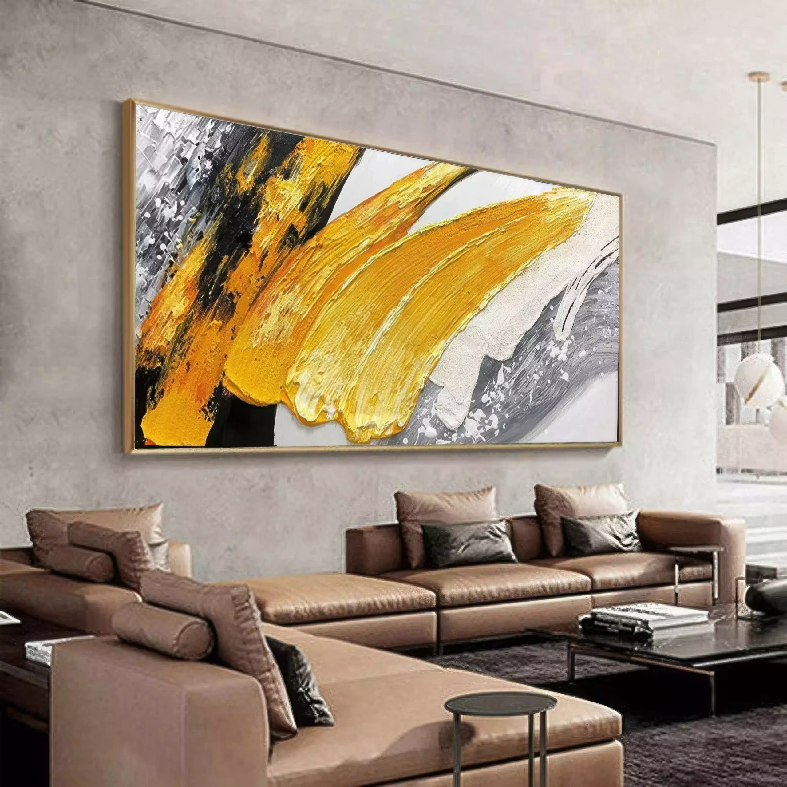 Un tablou impasto modern, ce juxtapune galben intens cu tonuri subtile de gri, creat pentru a insufla energie spatiului tau.